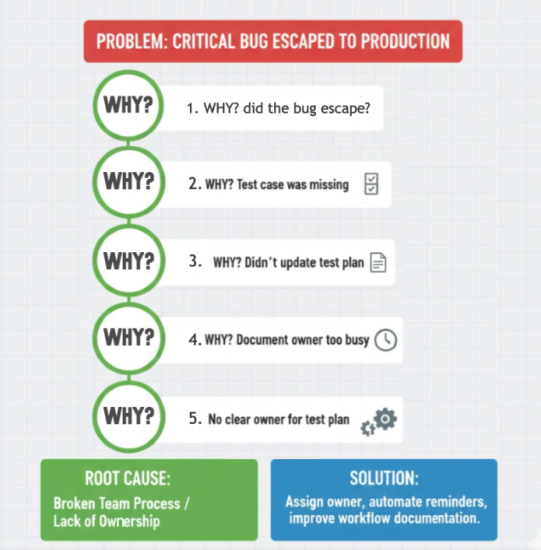 A powerful tool that links these two worlds is the 5 Whys. This simple method helps us dig past the obvious problem to find the real, hidden reason. In software, if a critical bug escaped to production, we don’t just blame the tester. We ask: Why did the bug escape? (Because the test case was missing.) Why was it missing? (Because we didn’t update the plan.) Why didn’t we update the plan? (Because the document owner was too busy.) By the fifth “Why,” we uncover a root cause, like a broken team process, not a broken person.