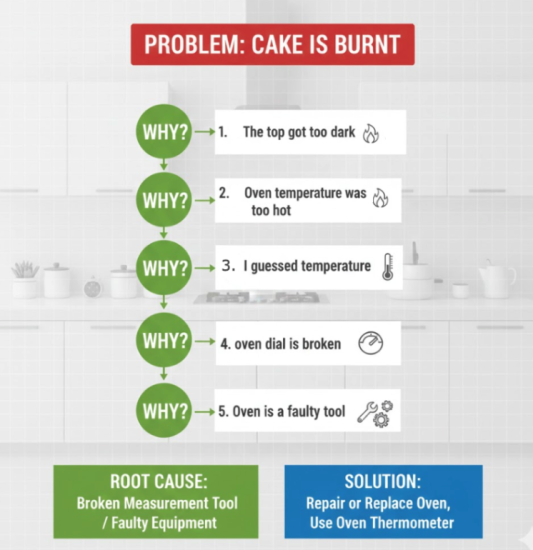In the kitchen, the 5 Whys stops us from just getting mad at a burnt cake. Why is the cake burnt? (The top got too dark.) Why did the top get dark? (The oven was too hot.) Why was the oven too hot? (Because I guessed the temperature.) Why did I guess? (Because the oven dial is broken.) The final “Why” reveals the true process defect: a broken measuring tool! The solution is fixing the oven, not just watching the cake closer. This applies to both the server room and the kitchen: fixing the process tool is better than fixing the mistake over and over.