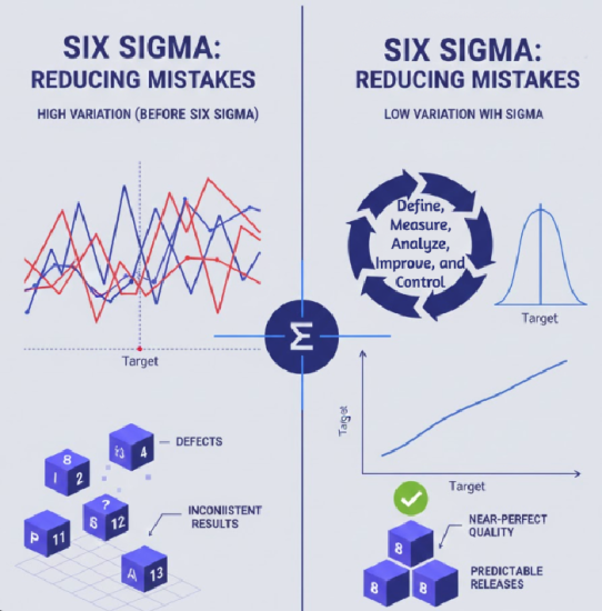 Next comes the heavy artillery: the Six Sigma side. This focuses intensely on reducing Mistakes (Defects) and Variation. A Six Sigma process aims for near-perfect quality, meaning the result is almost the same every time, making your software (or your food) perfectly reliable. In testing, this means using the DMAIC cycle (Define, Measure, Analyze, Improve, and Control) to investigate why certain bugs are still escaping to customers. We need to reduce the natural “variation” that happens when different engineers test different ways, leading to inconsistent quality and unpredictable release dates.